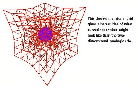 This 2-dimensional graphic is not so correct though but it does help grasp what is happening. A better graphic is this one, showing the bending of space and time, space-time, being warped, stretched, and shaped in 3 dimensions rather than just two.