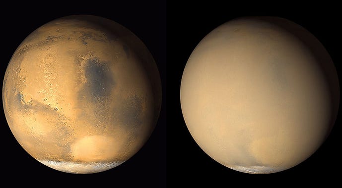 You might recall that this dust storm was visible from Earth, with Mars shining unusually bright in the night sky. Its brilliance was so remarkable that even casual observers couldn't help but notice the striking glow emanating from the Red Planet during this extraordinary event.