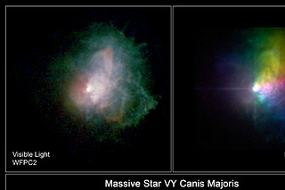 VY Canis Majoris is surrounded by an extensive and dense asymmetric red reflection nebula, formed from the material lost from the star.