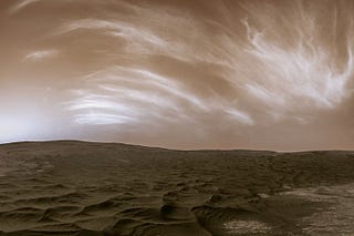 Overhead, light and wispy cirrus clouds can be seen drifting on Mars.